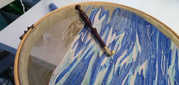 Tambour is a hooked embroidery created on the surface of strong, sheer, and almost netted fabric such as silk organza (or more recently embroidery tulle).